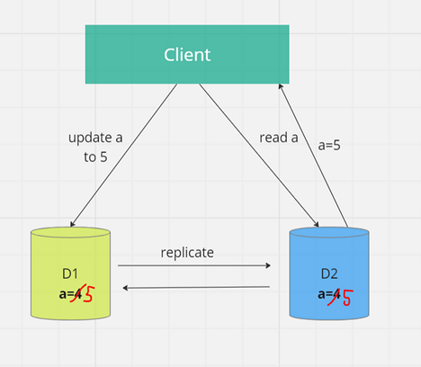 فرض کنید سامانهای داریم با یک کلاینت و دو گرهی پایگاهداده به نامهای d1 و d2. حال اگر بهصورت همزمان، به d1 یک درخواست بروزرسانی و به d2 یک درخواست خواندن ارسال کنیم، در صورتی که همگامسازی بین d1 و d2 بهدرستی انجام شود، دادهی بهروز قابل دسترسی خواهد بود. این یعنی یکنواختی برقرار است.